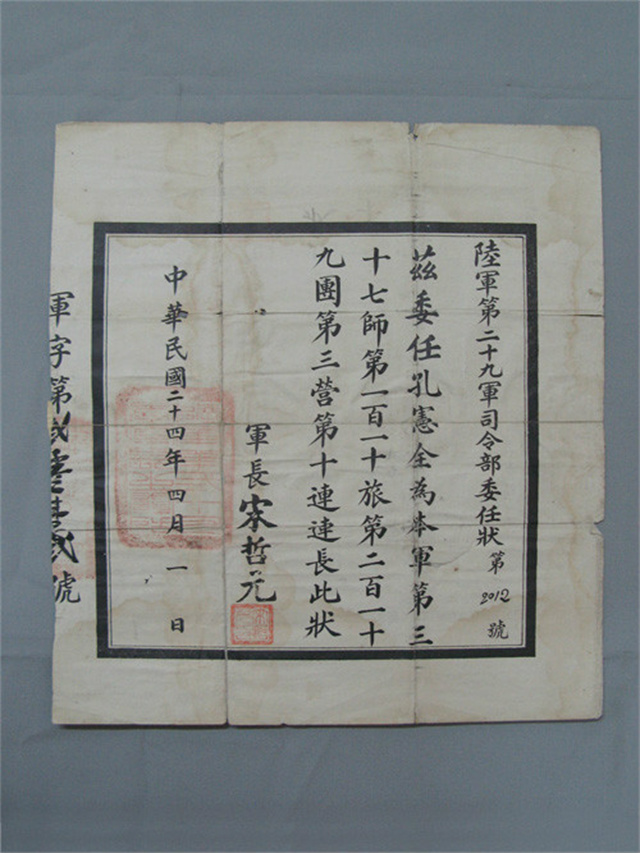 孔憲全委任狀第29軍219團(tuán)3營10連連長孔憲全委任狀